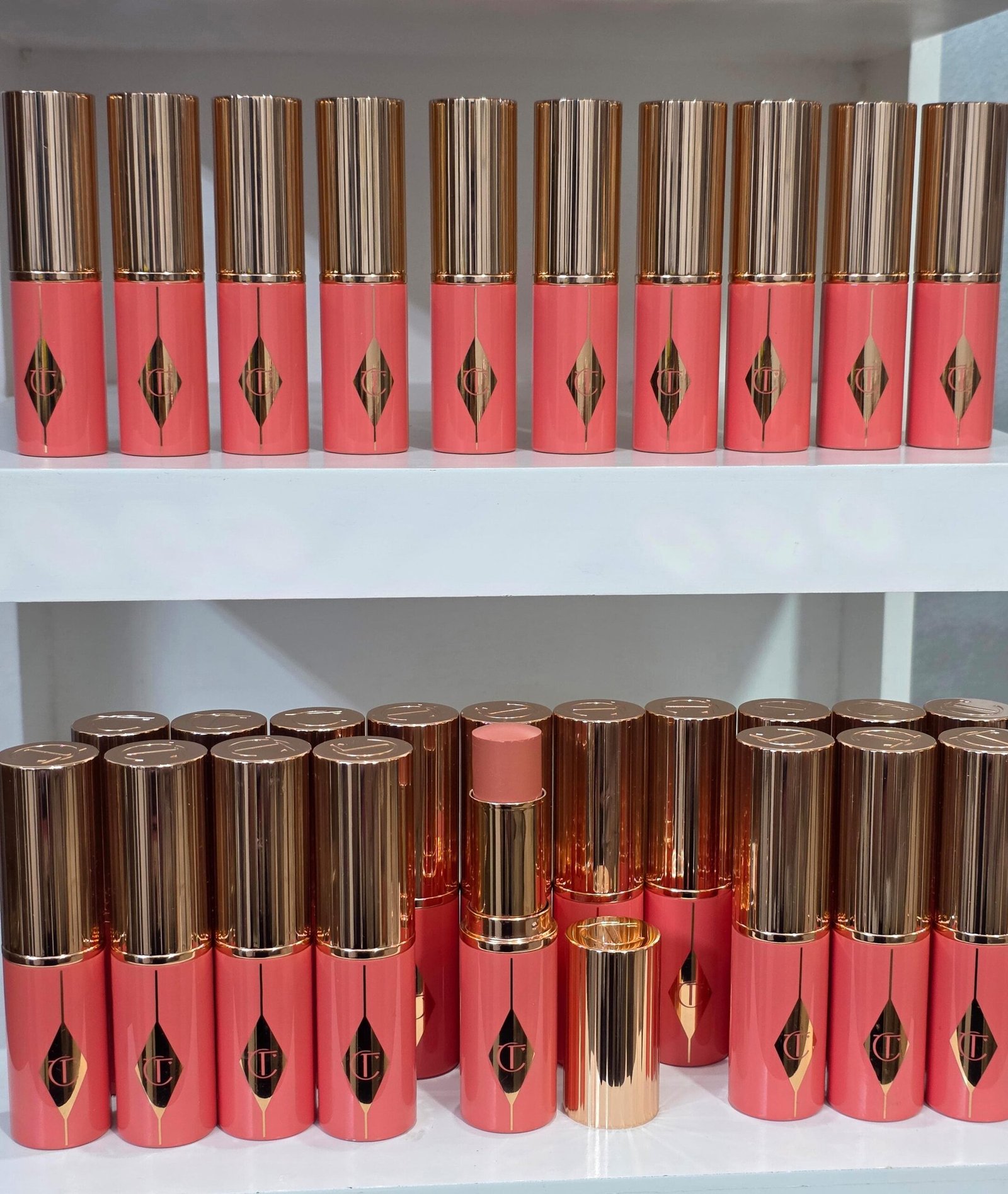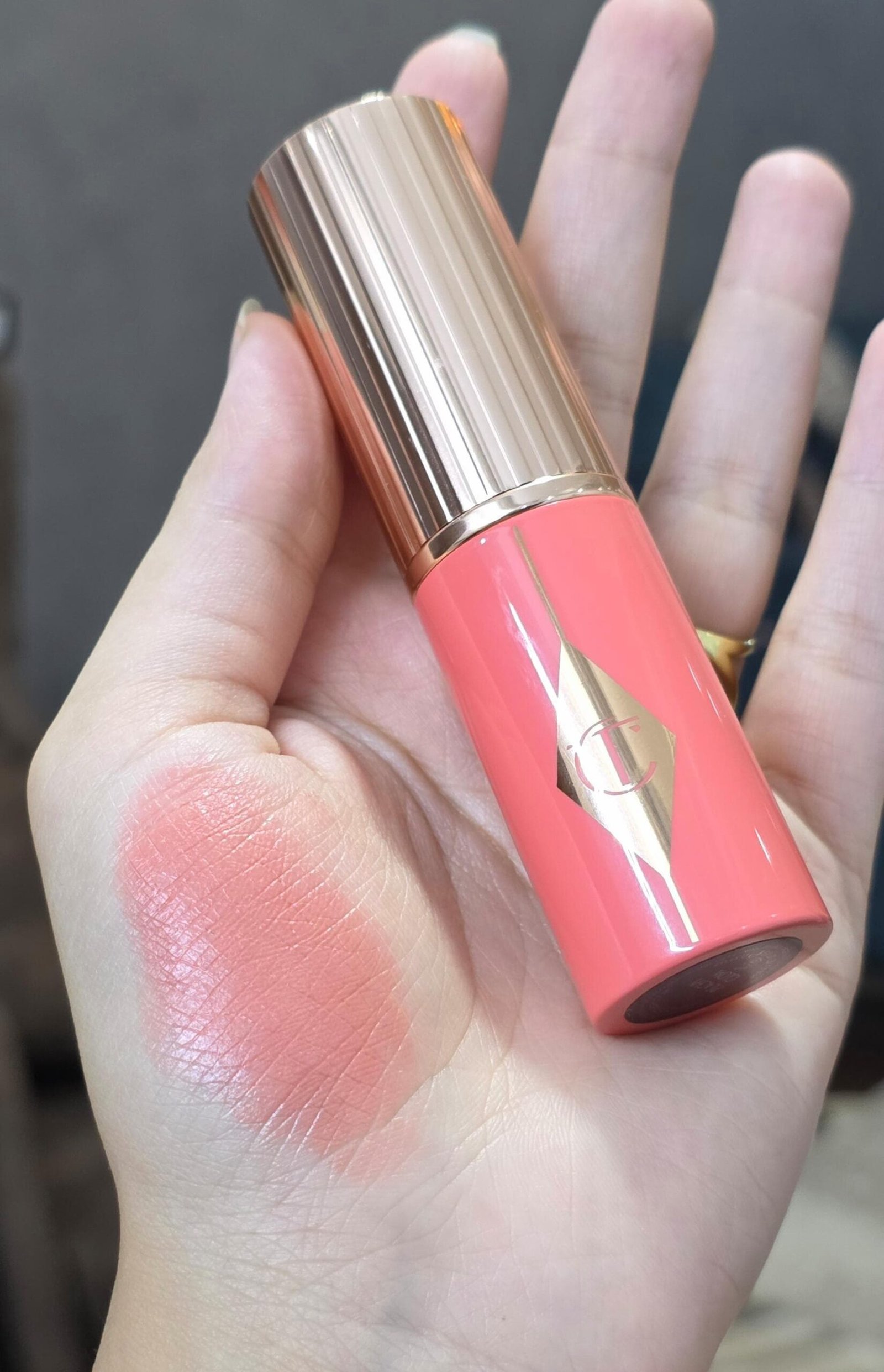 Charlotte Tilbury Unreal Blush Healthy Glow Stick in the shade “Peachy Glow”.