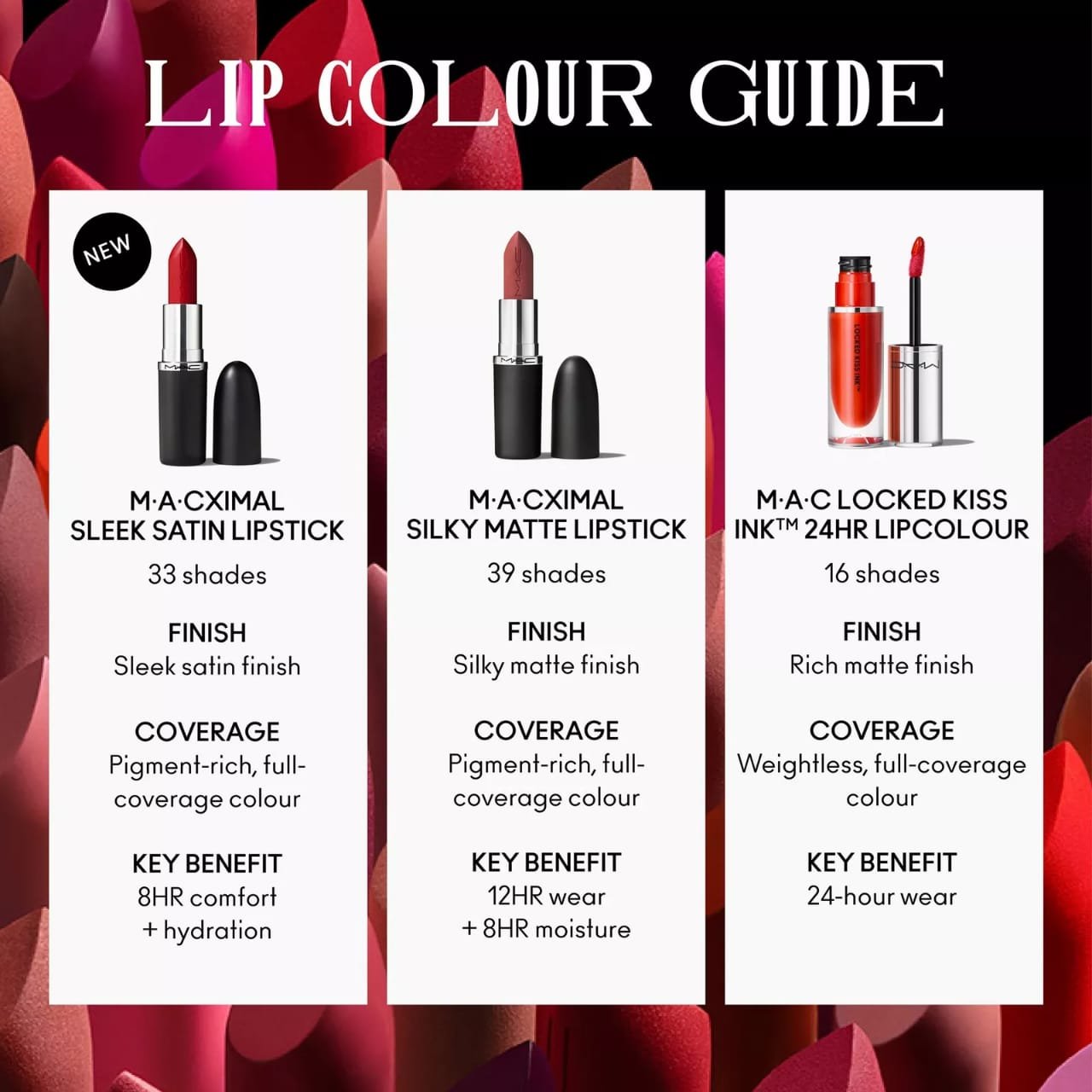 M·A·Cximal Sleek Satin Lipstick is a sleek satin lipstick with full-coverage, pigment-rich colour in a comfortable formula that hydrates lips for eight hours