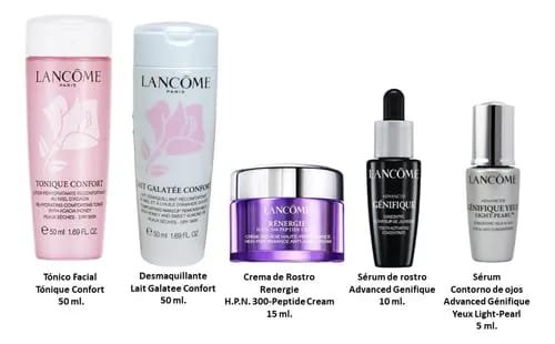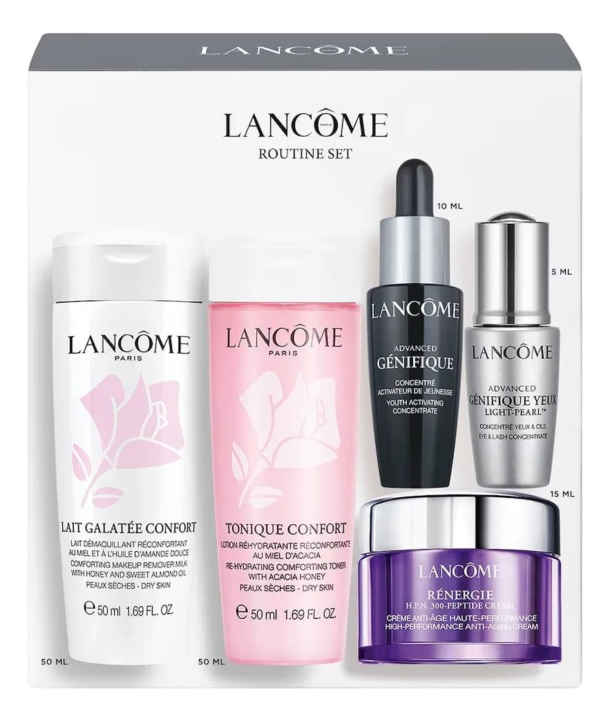 The specific products in this set include Lancôme’s Lait Galatée Confort (cleanser), Tonique Confort (toner), Advanced Génifique Serum, and Rénergie skincare.